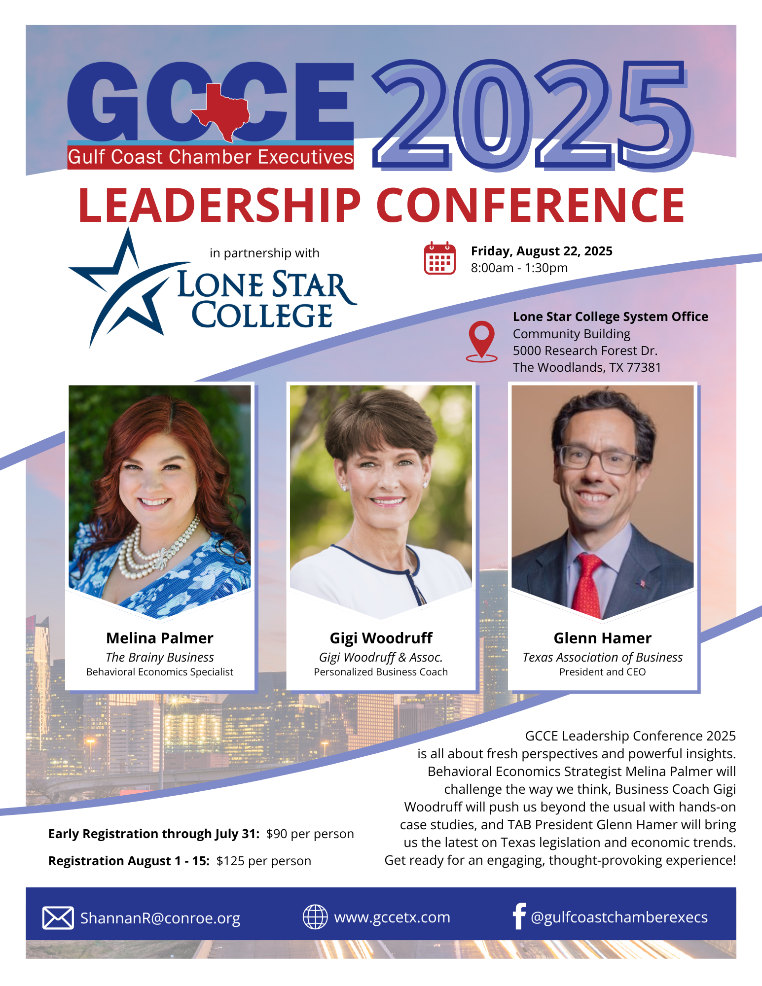 GCCE Leadership Conference 2025 is all about fresh perspectives and powerful insights. Behavioral Economics Strategist Melina Palmer will challenge the way we think, Business Coach Gigi Woodruff will push us beyond the usual with hands-on case studies, and TAB President Glenn Hamer will bring us the latest on Texas legislation and economic trends. Get ready for an engaging, thought-provoking experience!